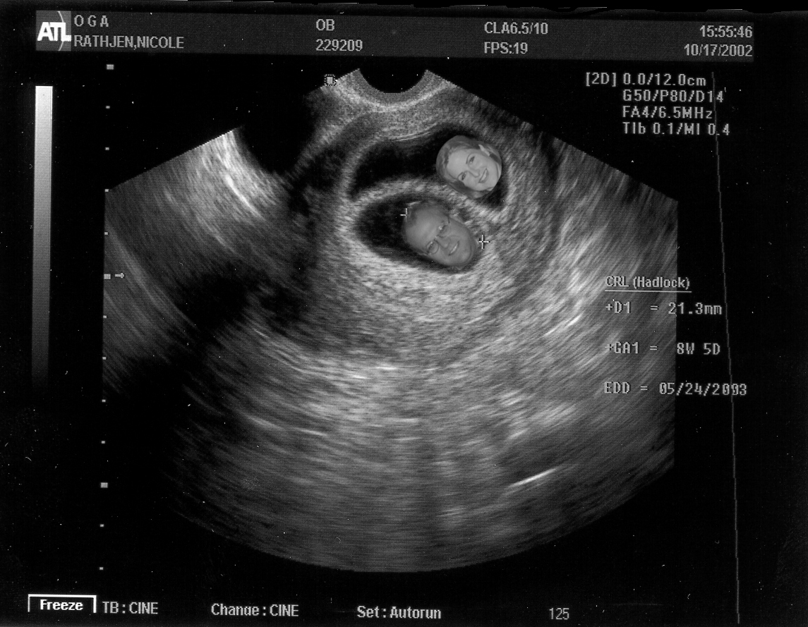 Computer-assisted age progression of the twins. Too bad they both didn't take after their mother...